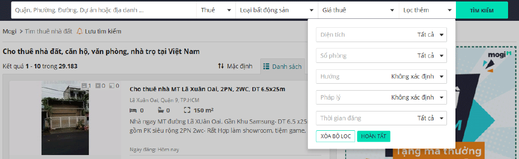 Bộ lọc thông minh của Mogi có thể giúp người tìm kiếm sàng lọc được tất cả thông tin chi tiết theo mong muốn. Từ những